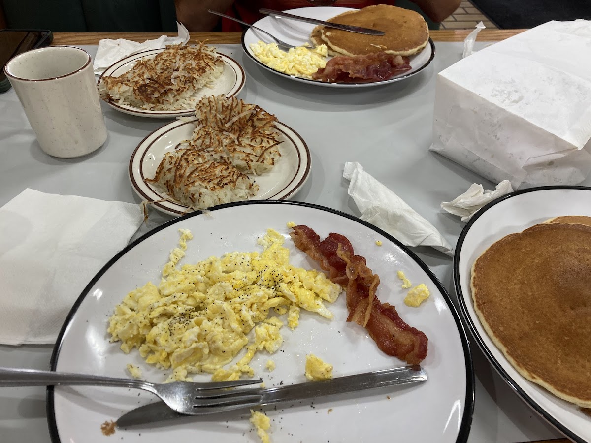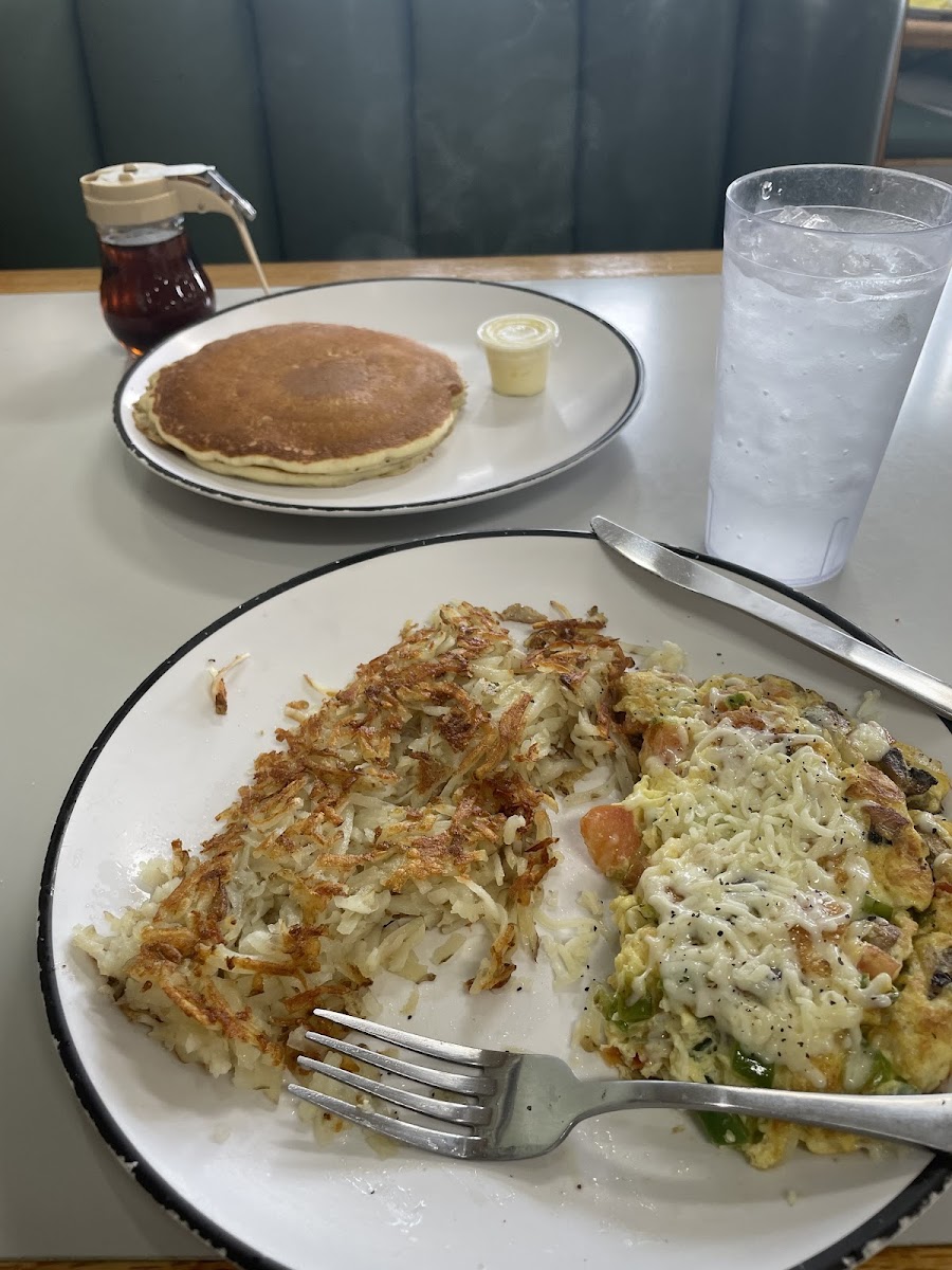 Fast Casual counter service then sit anywhere you want in padded booths. All day breakfast; cheese omelet comes with hash browns and your choice of toast. I had the sourdough toast and it was perfectly toasted. My omelette was fluffy and the hash browns crispy on top and soft underneath just like I like them!! Even the fresh cut lemon slices were delicious in my water. With my senior discount I got a fantastic meal for just under $10. I wish I lived closer so I could come here all the time! I am in the area frequently so I will be back!!!